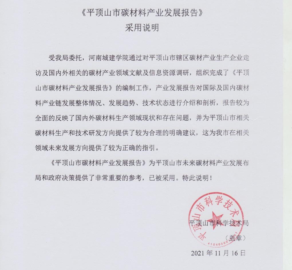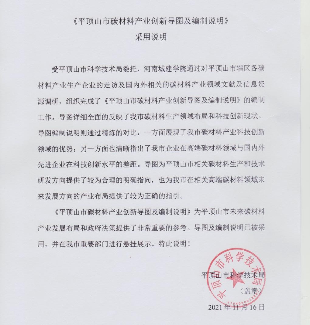 1.平顶山市“中国尼龙城”建设科技创新导图、平顶山市碳材料产业科技创新导图及产业发展报告的编制;