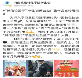 太阳成集团tyc9728认真组织并开展了此项工作,遴选出两份主题突出、健康向上、创意精彩,且具有一定思想引领意义、教育启发功能和审美文化特征的平面类优秀作品,通过微信公众号、QQ空间、板报宣传等两线结合的方式对优秀作品进行宣传展示。这些作品不仅体现了学生对诚信的深刻理解和积极态度,展现出他们的创新精神和社会责任感,更充分彰显了我院资助育人的工作成效,在广大师生中引起积极反响。