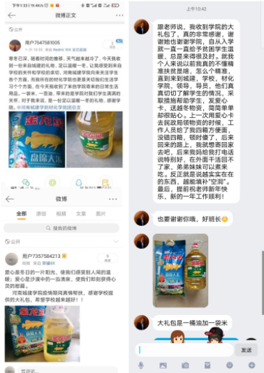 在线上走访时,学院领导及老师深入的了解了经济困难学生的家庭状况和遇到的实际困难,并为21名同学寄去了新年礼包。一袋米、一壶油,虽不贵重,却让同学们在严严冬日里感受到了来自学院和学校的温暖。礼包送出后,同学们反响强烈,纷纷通过微博、QQ等网络平台表达了对学院以及学校的真挚感谢。同时,同学们均表示绝不会辜负国家的政策和关怀,要继续发奋图强,锐意进取,将来为祖国的现代化建设贡献力量,回馈社会。