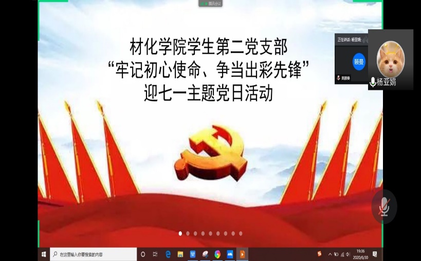 (通讯员:杨亚娟)值此中国共产党成立99周年华诞之际,为教育引导支部党员继续深入学习领会党的创新理论,重温党的光辉历史,6月30日下午材化学院学生第二党支部开展“牢记初心使命,争当出彩先锋”线上主题党日活动,会议由支部书记杨亚娟主持,支部全体党员积极参与。