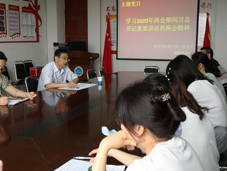 (通讯员 王宁)6月23日下午4点,材化学院教工第一党支部在学院会议室开展主题党日活动,主题党日以“学习习近平总书记两会期间重要讲话和全国两会精神,提高自身履行使命任务能力”,副校长杨风岭参加,党支部书记胡继勇主持。
