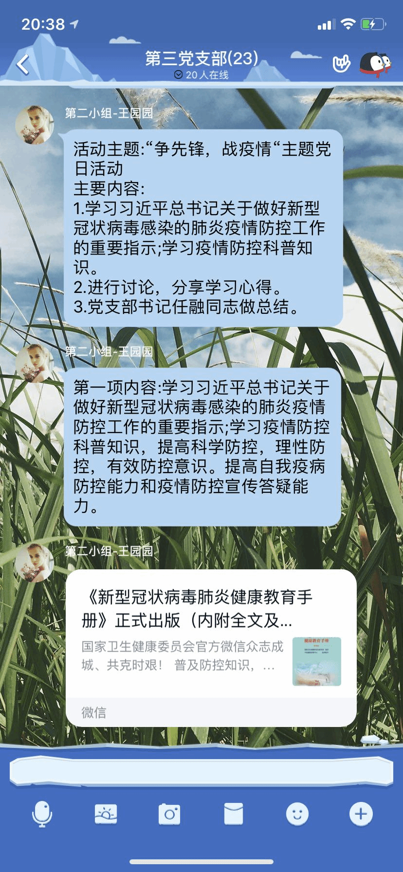 当前正值抗击新冠疫情的关键时期,按照上级党委要求,太阳成集团tyc9728学生第三党支部在2月26下午18点整,利用QQ工作群开展了以“争先锋,战疫情”为主题的线上党日活动,应到党员22人,实到党员21人,本次活动由王园园同志主持,大家积极分享学习心得,党支部书记任融同志做总结发言。