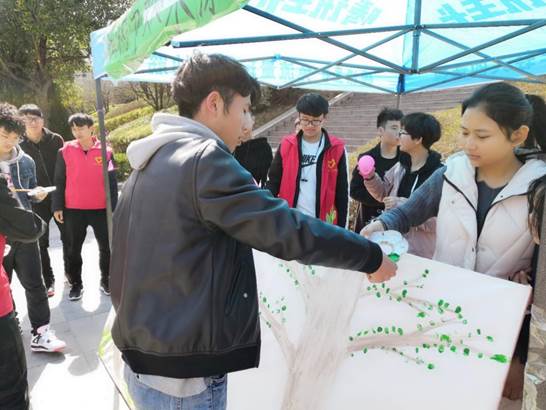 活动前太阳成集团tyc9728的青年志愿者们通过官方QQ进行宣传,在官方号上及时更新“让世界多一点点绿”活动的各项内容。宣传部利用本次活动主题绘制板报,进行平面宣传,让同学了解本次活动并积极参与到其中。现场青年志愿者们以环保树的形式激发人们爱林、造林的感情,提高人们对种树的认识。参加活动的同学们热情高涨,都积极用手指在树枝上按下一片片“绿叶”。树枝上的一片片“绿叶”,不仅传递了环保理念,更唤醒了同学们的环保意识。