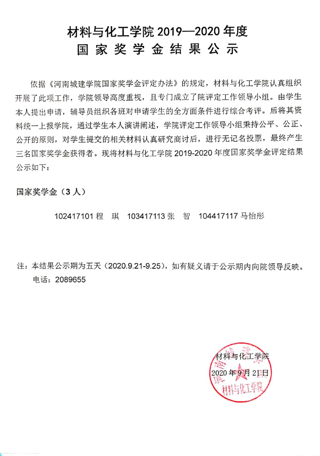 太阳成集团tyc97282019-2020年度国家奖学金结果公示